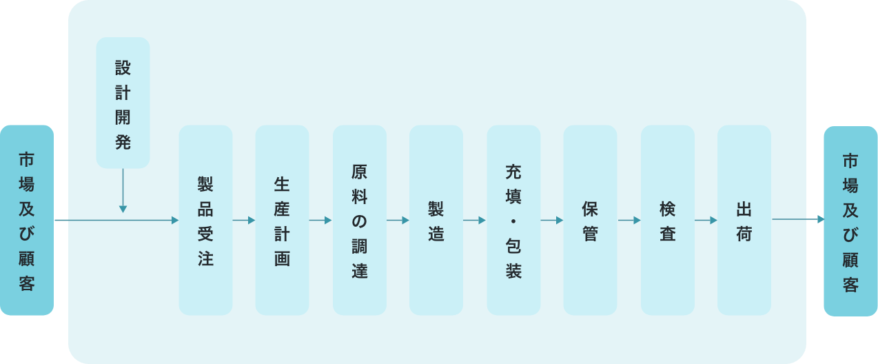 継続的な改善を行うため、設計開発から原材料の調達、製造、充填・包装、保管、検査、出荷までの製品がお客様の手に渡るまでの全てのプロセスを対象として基準を定めレビューを行うことで、全社的な品質保証体制の強化を図っています。